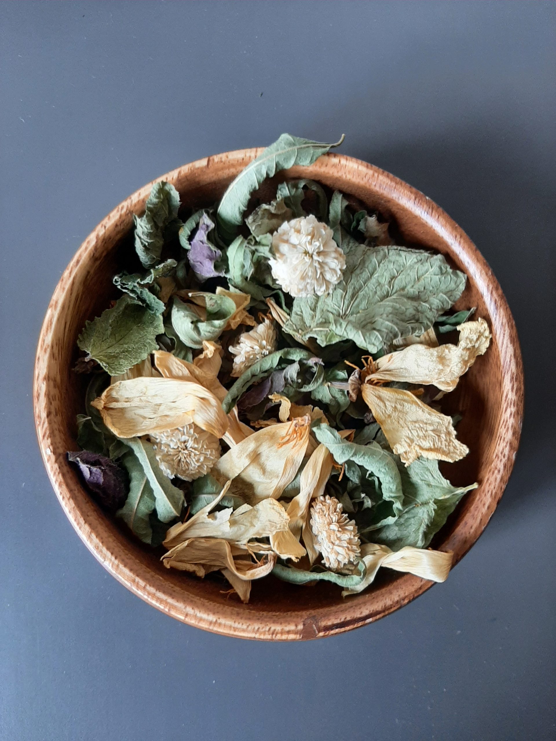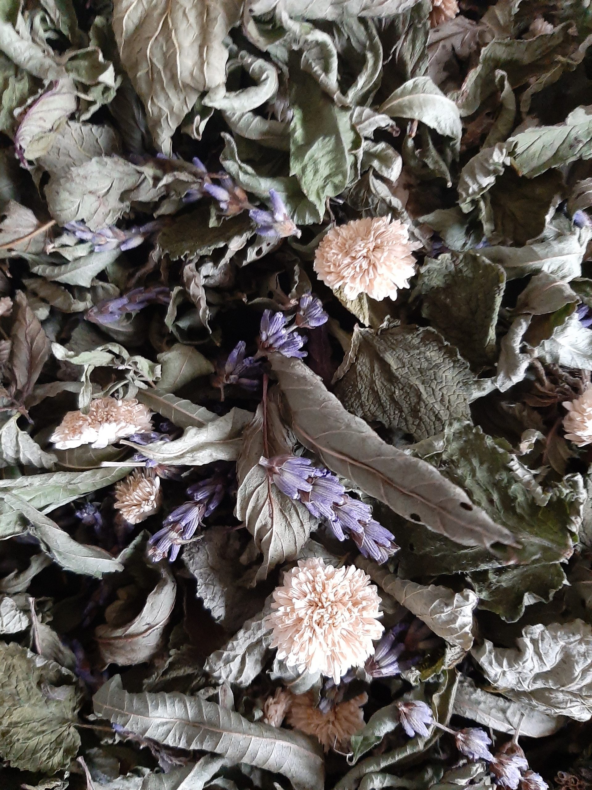 composition: feuilles de verveine citronnée, feuilles de menthe poivrée, fleur de camomille romaine, fleurs de lavande, feuilles de mélisse.