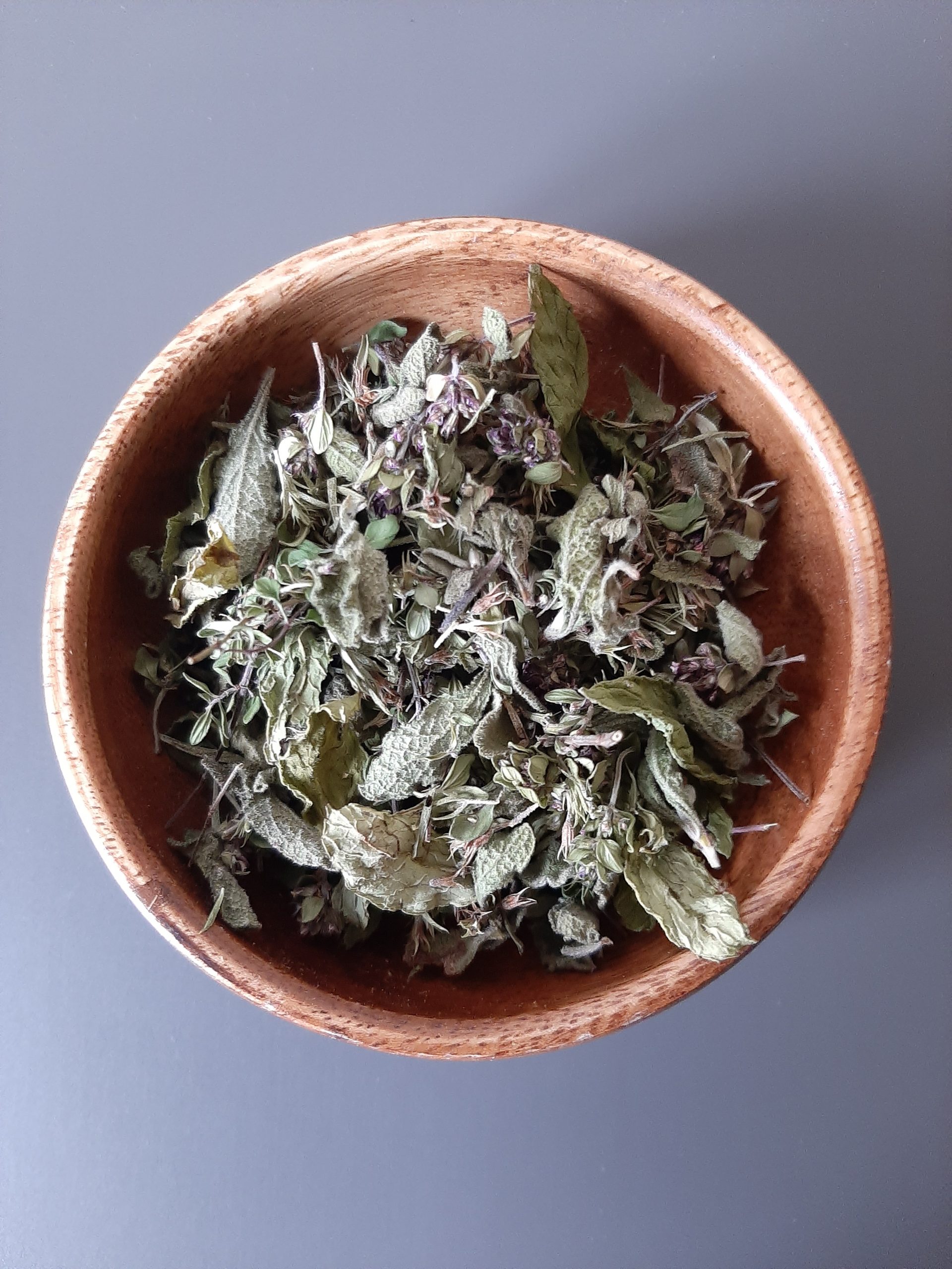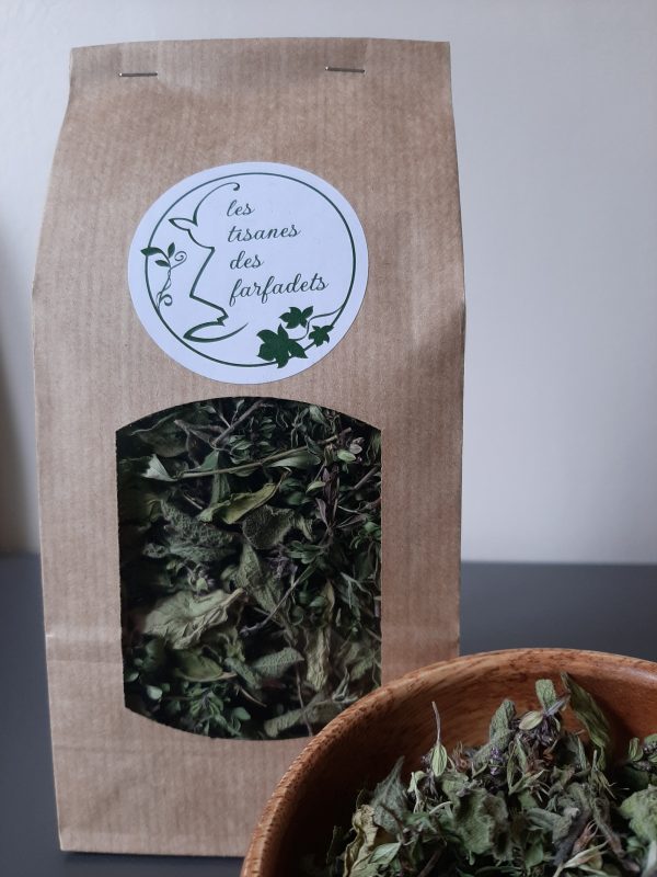Composition: feuilles de verveine citron, feuilles de ciste à gomme, feuilles et fleurs de thym citron, feuilles de sarriette, feuilles de menthe verte.