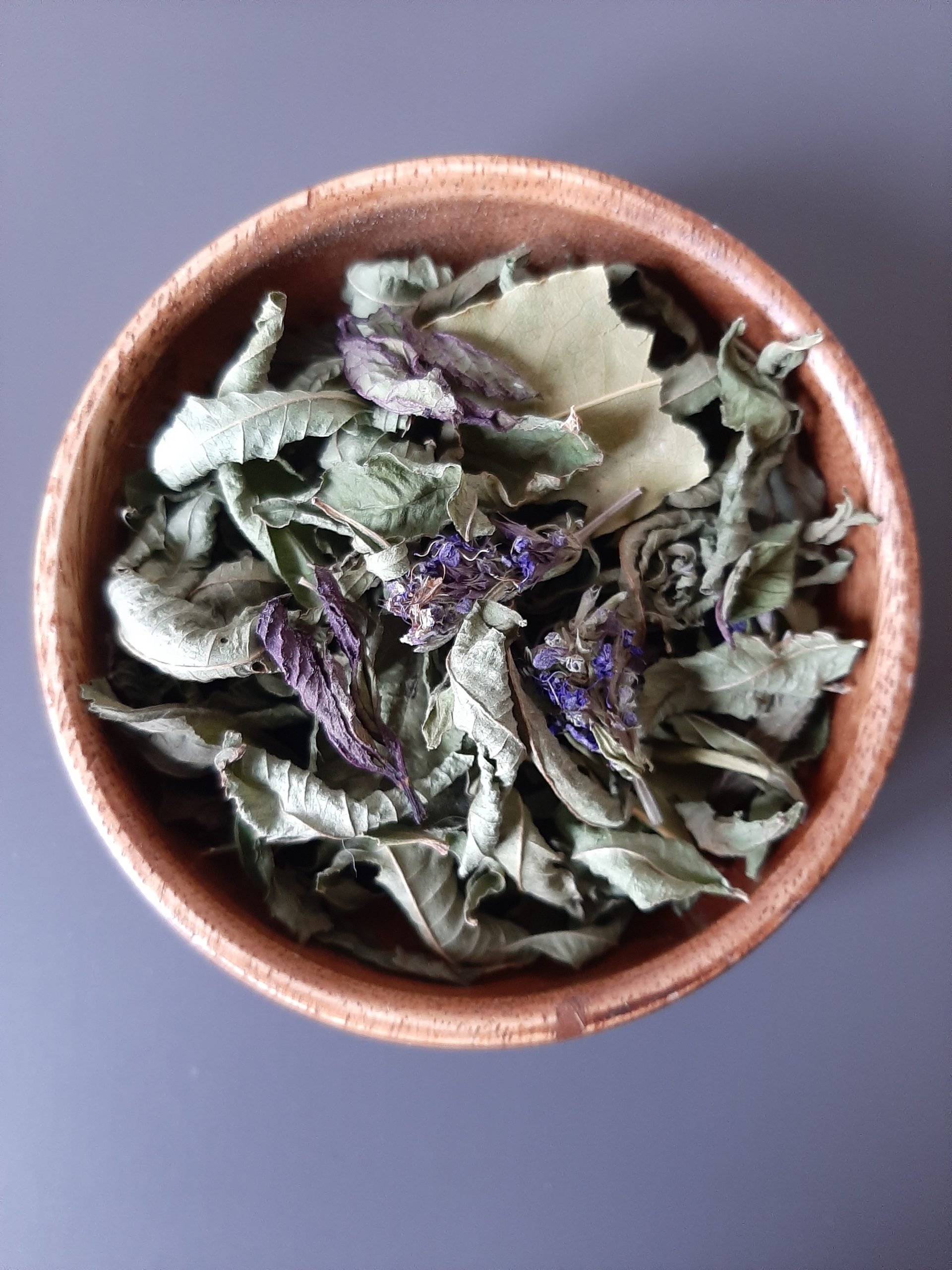 Composition: feuilles de verveine citron,feuilles de menthe poivrée,feuilles et fleurs de sarriette,feuilles et fleurs d’hysope,feuilles de laurier sauce.