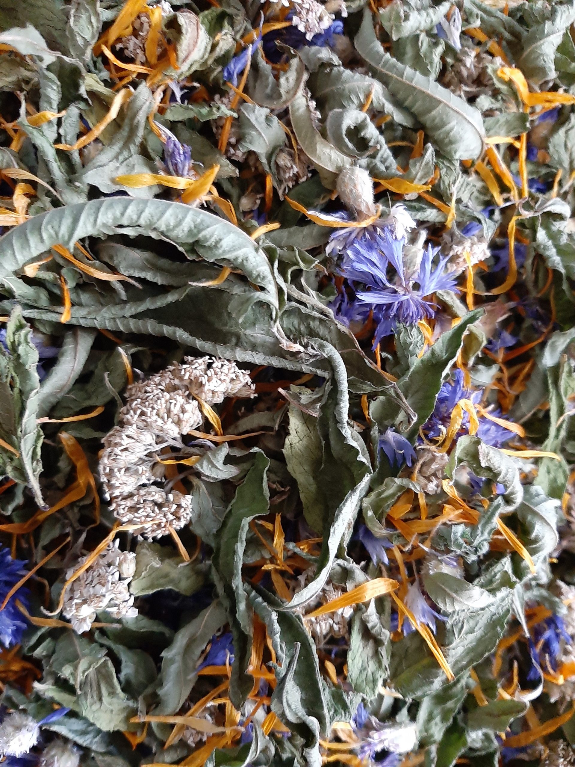 Composition: feuille de verveine citron, fleurs d’achillée millefeuille, feuilles de menthe verte, fleurs de bleuets, fleurs de calendula.